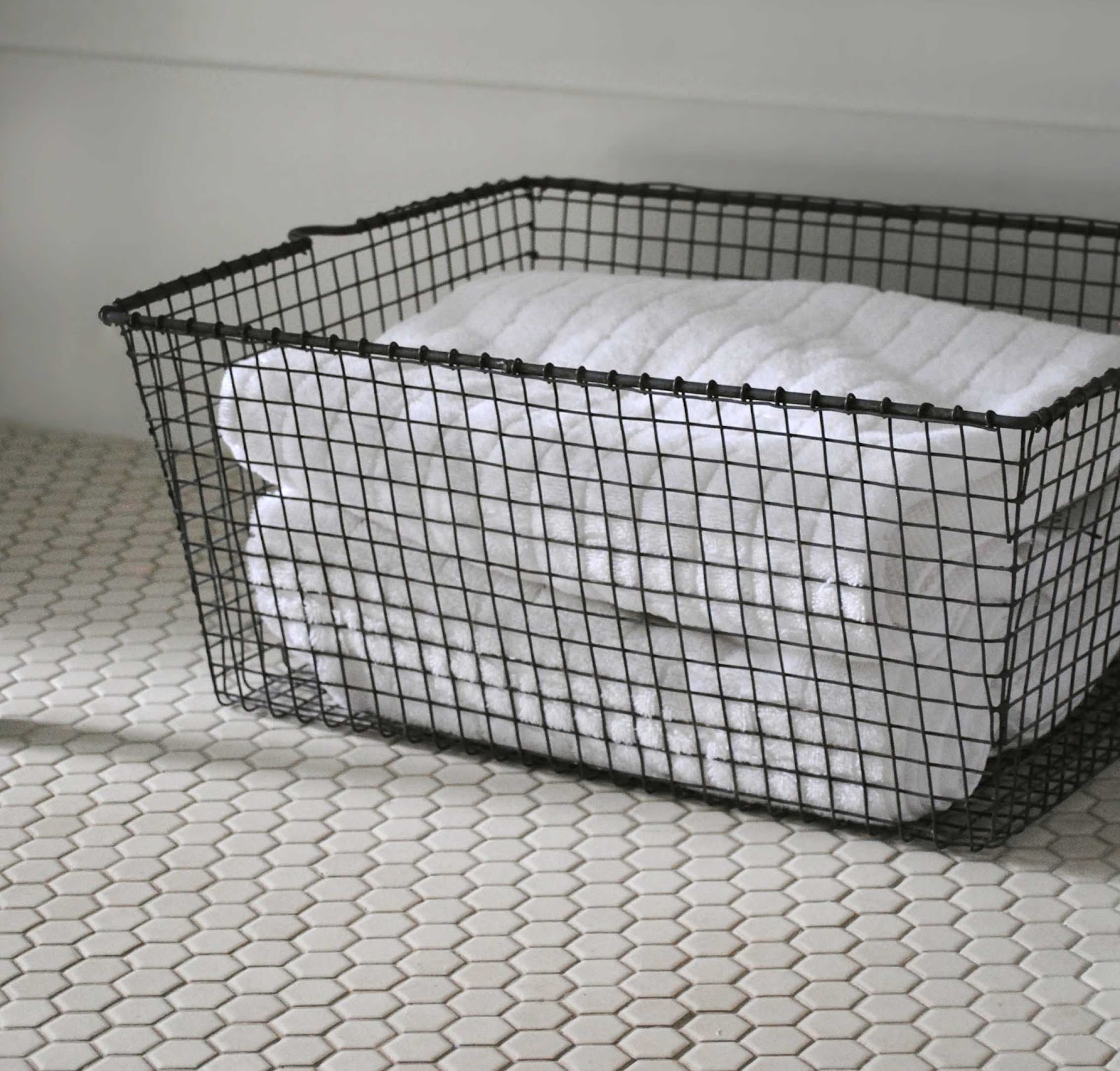 Hexagonal tiles would have been common in homes of this period. Susan found these wire baskets from R. Hardware.