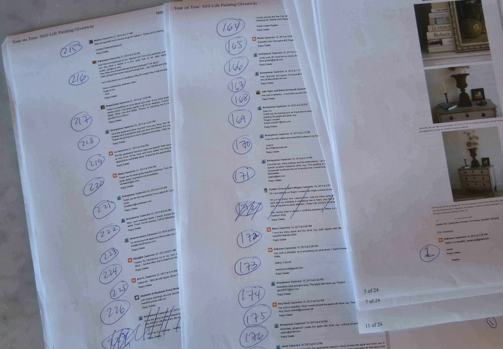 WOW, so many of you took the time to enter the drawing – many, many thanks!!! Your support and kind words regarding Liz’s work mean a lot to both of us. There were a total of 250 comments, but only 237 qualified. Some comments posted twice (in which case the second was stricken), and some were replies / follow-ups / clarifications. I printed out all the pages for review and numbered each comment. Because there was such a positive response, Liz and I decided to draw two names and give both paintings away.