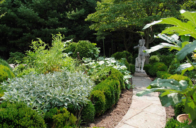 The upper parterre garden is divided into 4 beds: herbs, potager, roses and perennials.