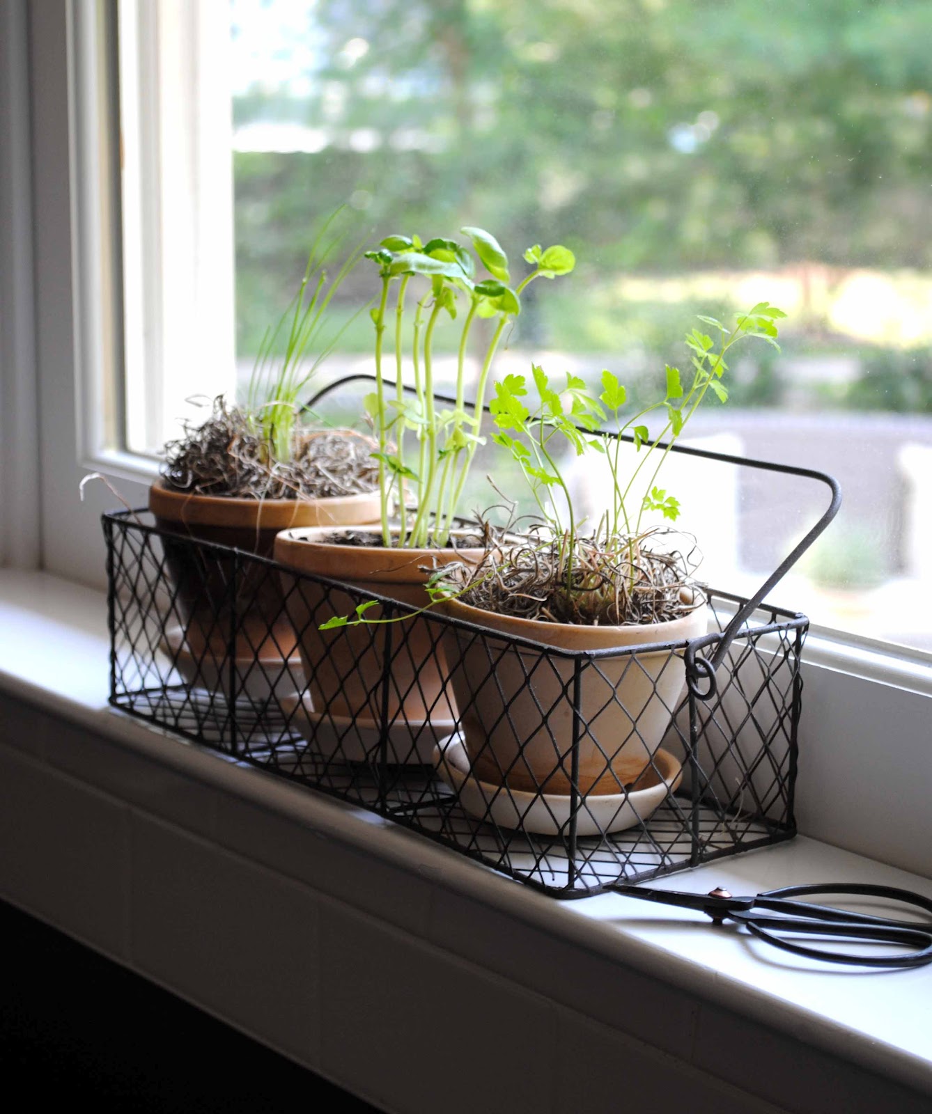 A corner of the new kitchen. Herbs are perched on the windowsill for quick access.