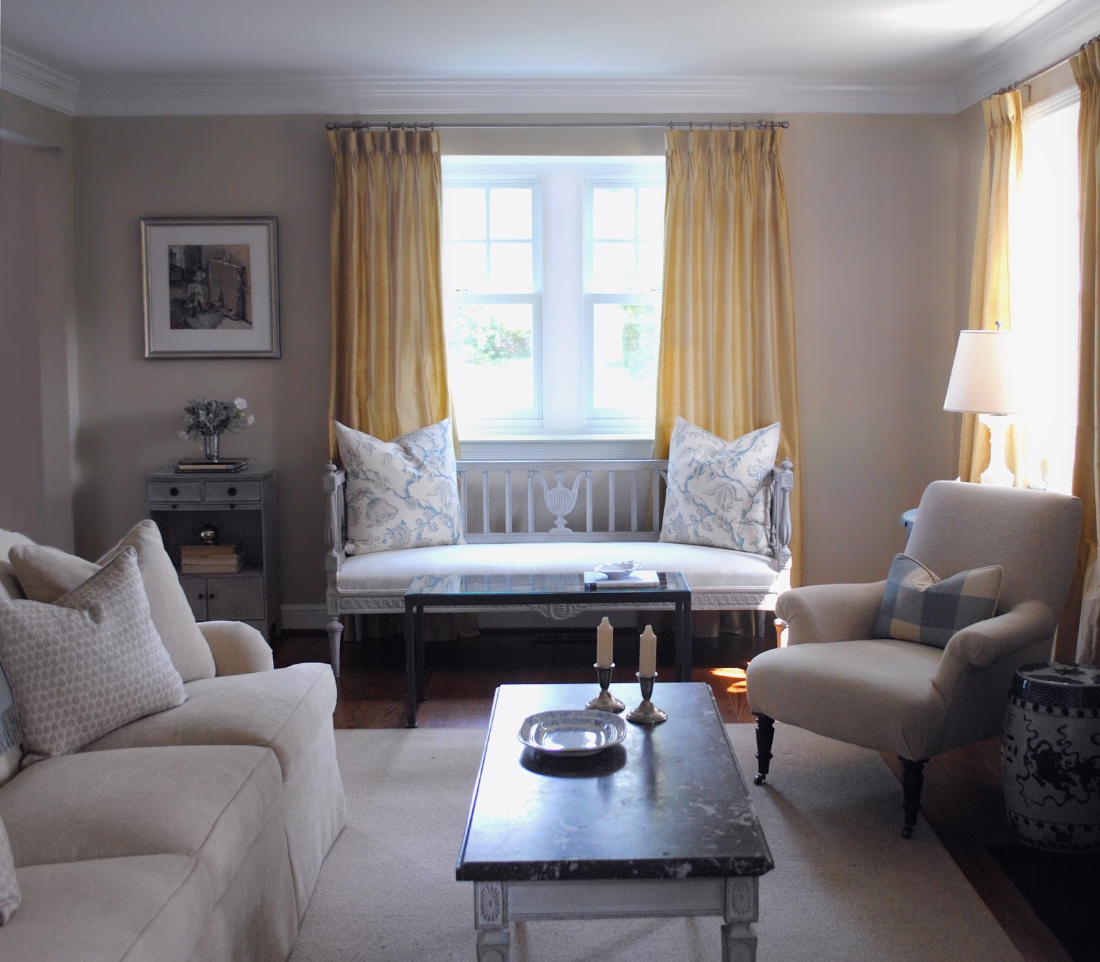 Shortly after my friends and clients, Susan and Greg, purchased their renovated colonial, they asked me to help update the interiors. Susan loves Swedish painted furniture, but did not necessarily want a Swedish style home. Since all the walls had already been painted and window treatments completed, I suggested mixing in Swedish pieces that complemented the traditional furniture and existing warm palette of golds and taupes.