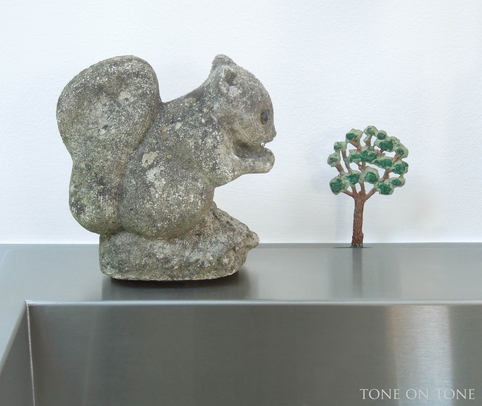 Who can resist this vintage stone squirrel? She’s found a spot near the myrtle topes.