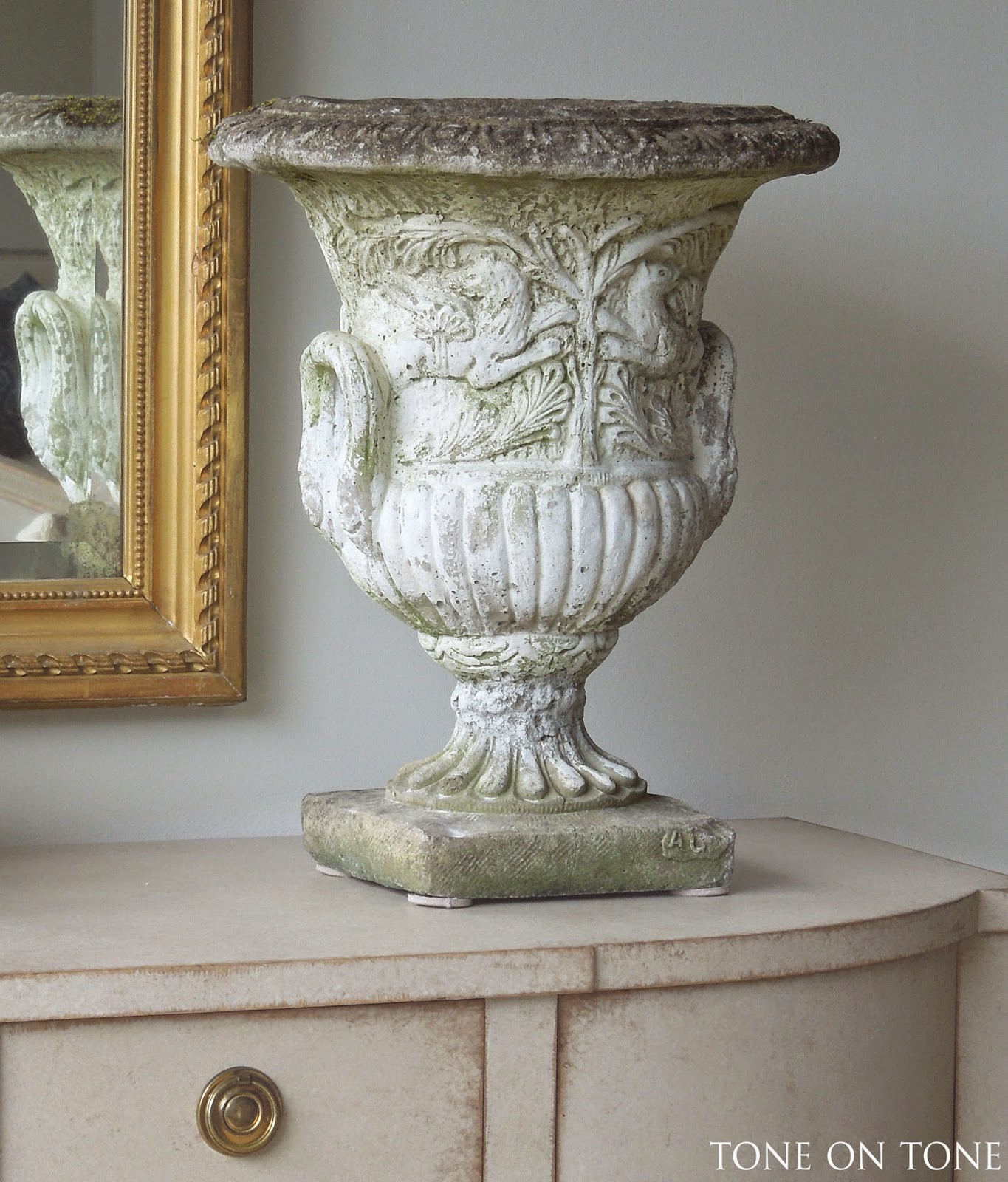 More for your garden or interior! This pair of footed urns has traces of old white paint and unusual lions (?) flanking a tree of life. There are also naive faces / masks on the side handles.
