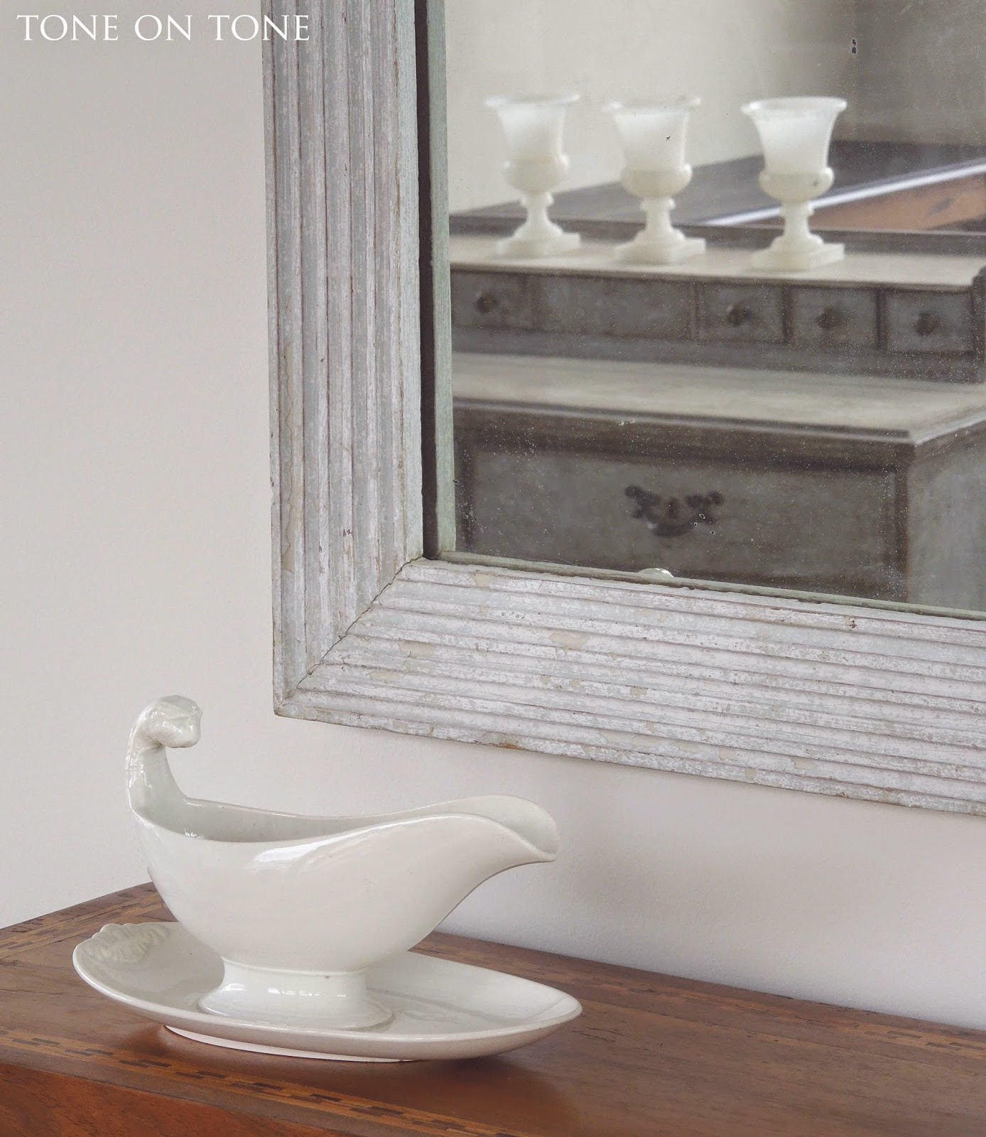 Two antique French mirrors with lovely old glass. The mercury glass in the gray trumeau is fabulous. Oooops, please ignore my arm 🙂