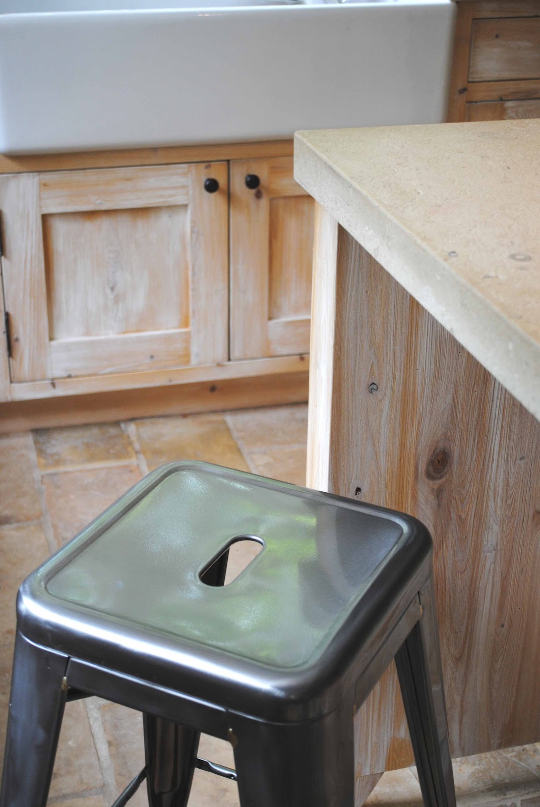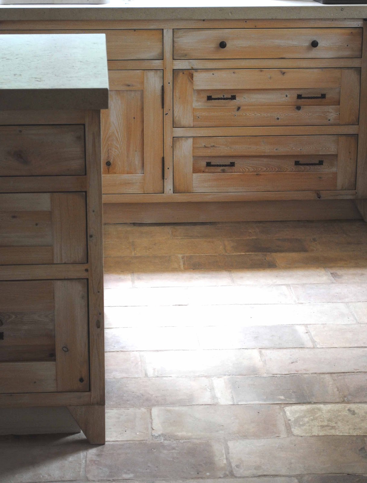 The floors are stunning and I LOVE the wood cabinetry! The limestone countertops are amazing! I am going to be putting the same countertop in a project I am doing! There are existing terracotta tile floors, too. NOT as old as these!! (Jealous!) The pendants from your shop paired with the floors give the room so much history and character! I just love thinking about who used the items before. Thanks for sharing! xoxo, K