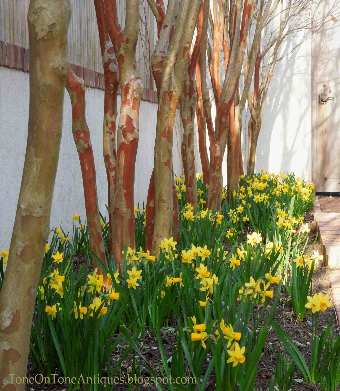 I love the sunshine the Tete-a-Tetes provide in your elegant garden. Those Crape Myrtle trunks are sublime.