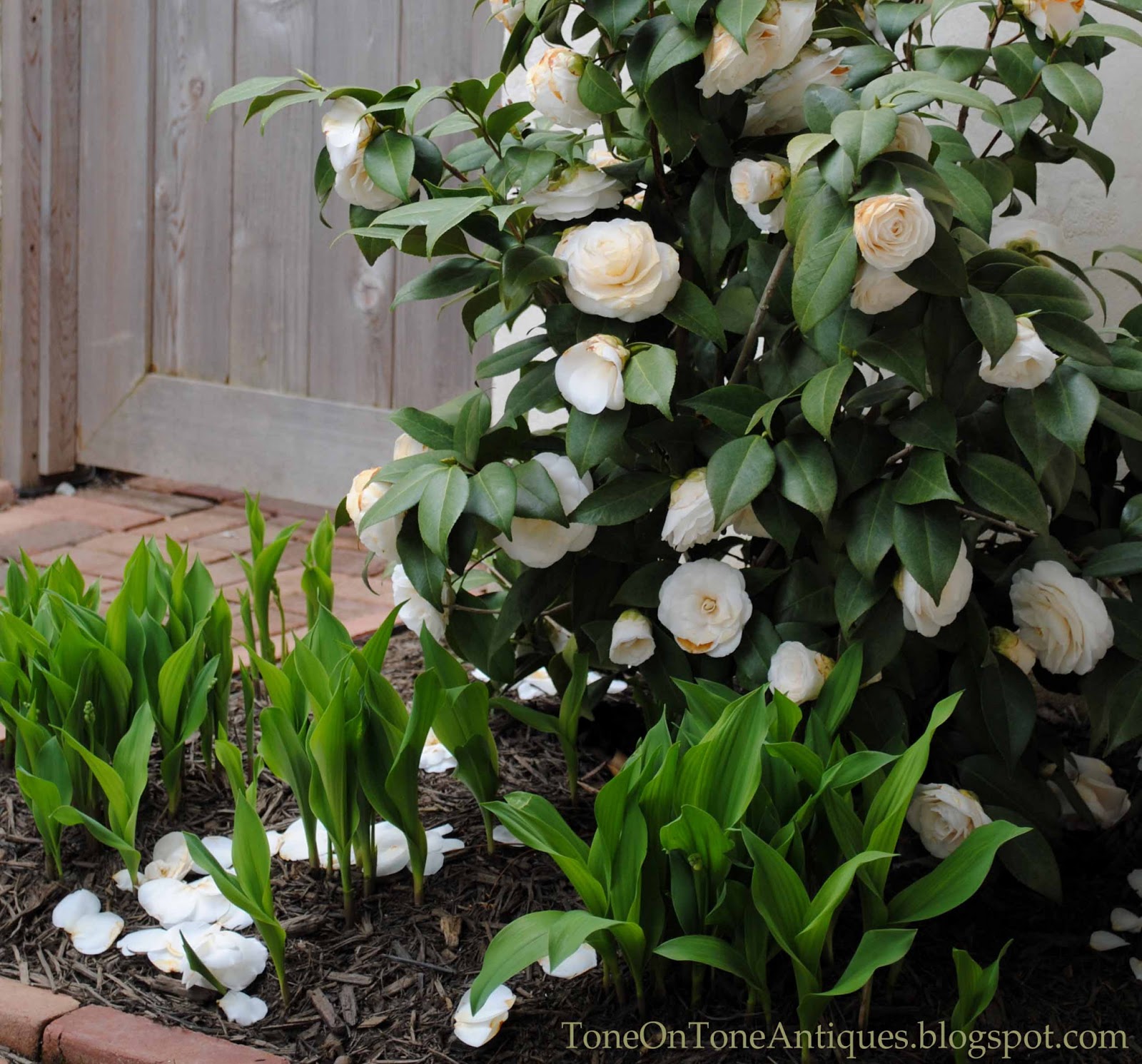 Next to the front door is this spring blooming camellia with double white flowers. I’m sorry I forgot the name. Anyone know? It is underplanted with white lilies of the valley dug from my friend Charlet’s garden.