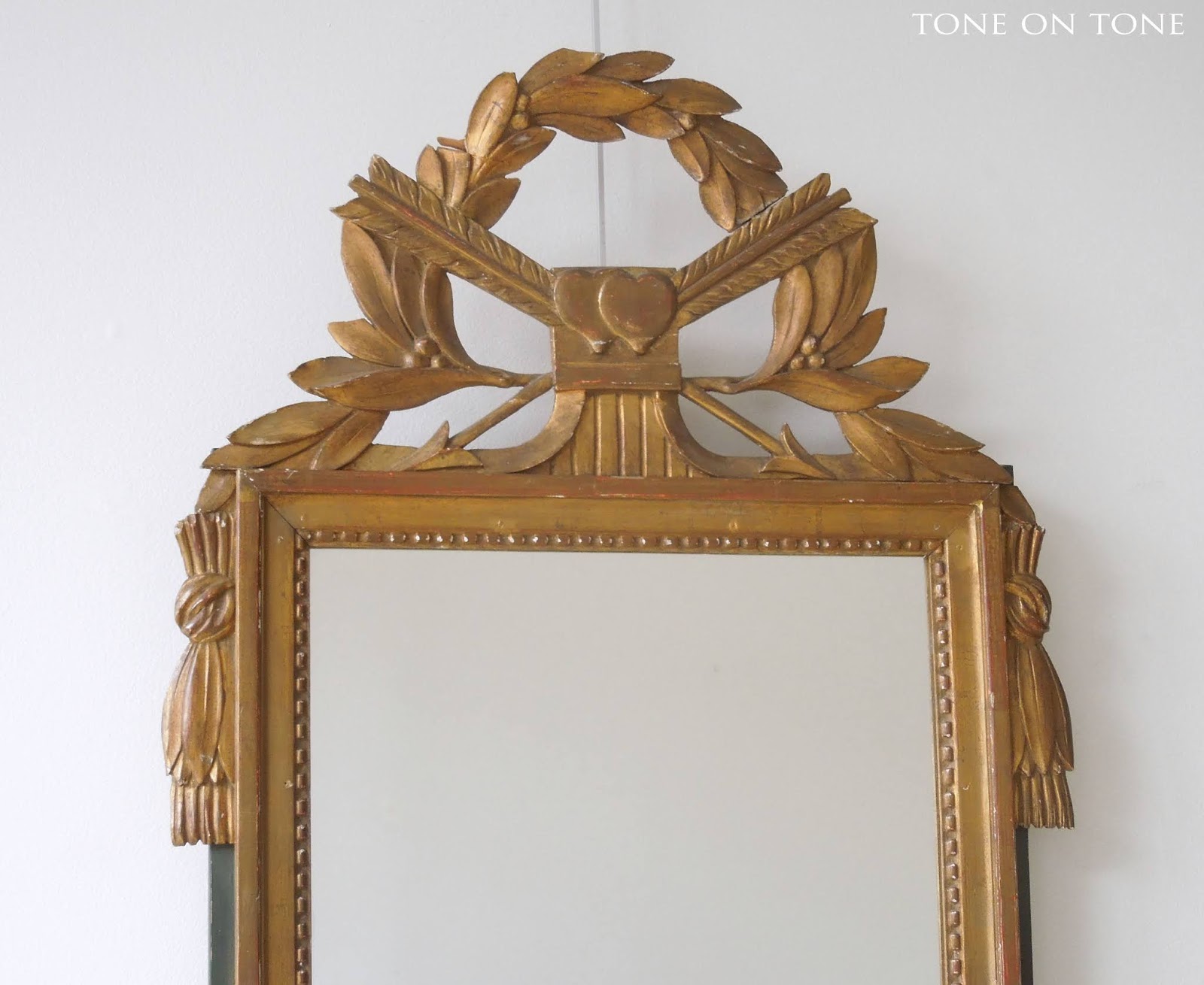 Here is a Louis XVI style giltwood mirror (20″ wide x 35.5″ overall height) crested with a laurel wreath. Two sweethearts give a hint to its origin – perhaps a courting mirror or marriage gift?