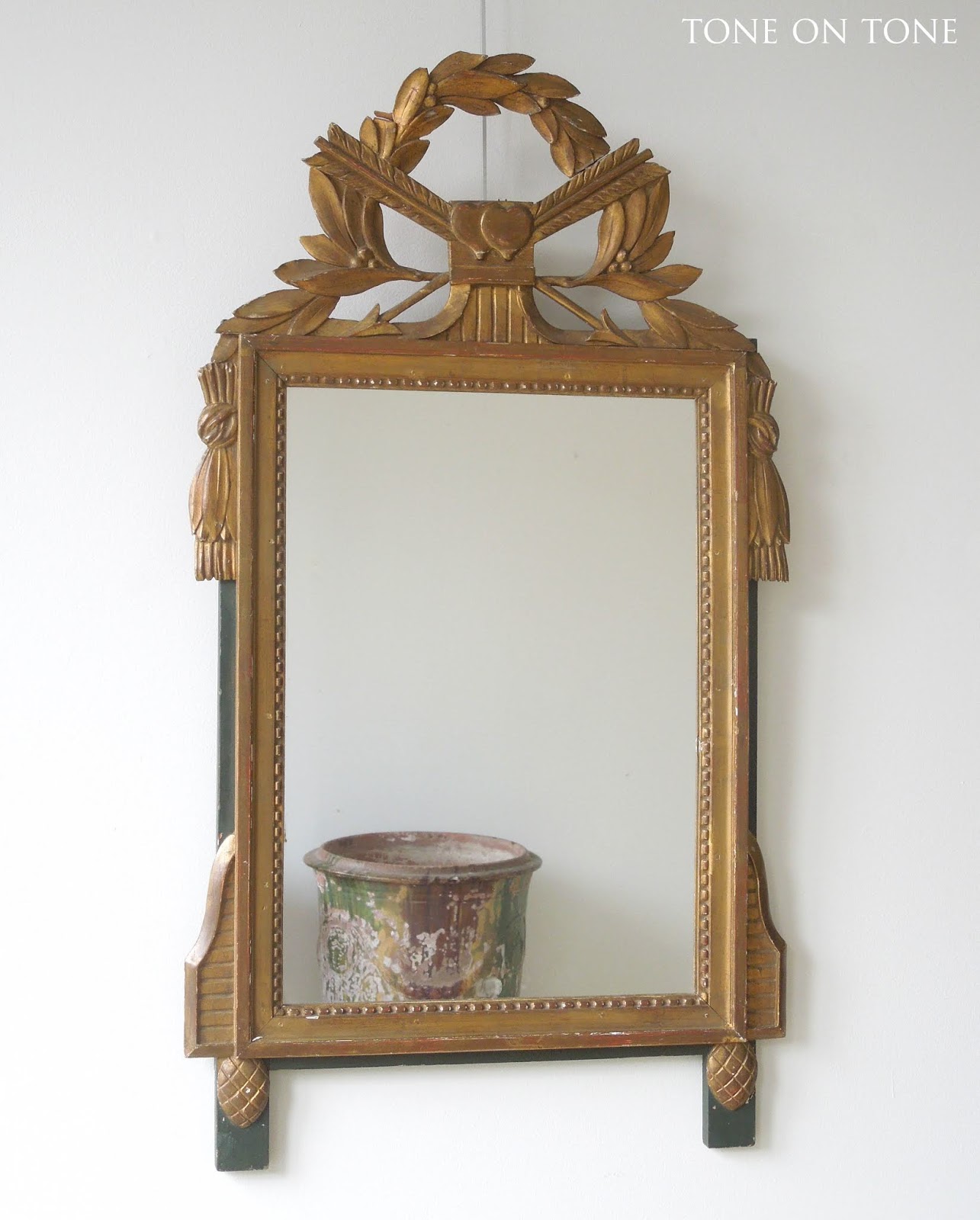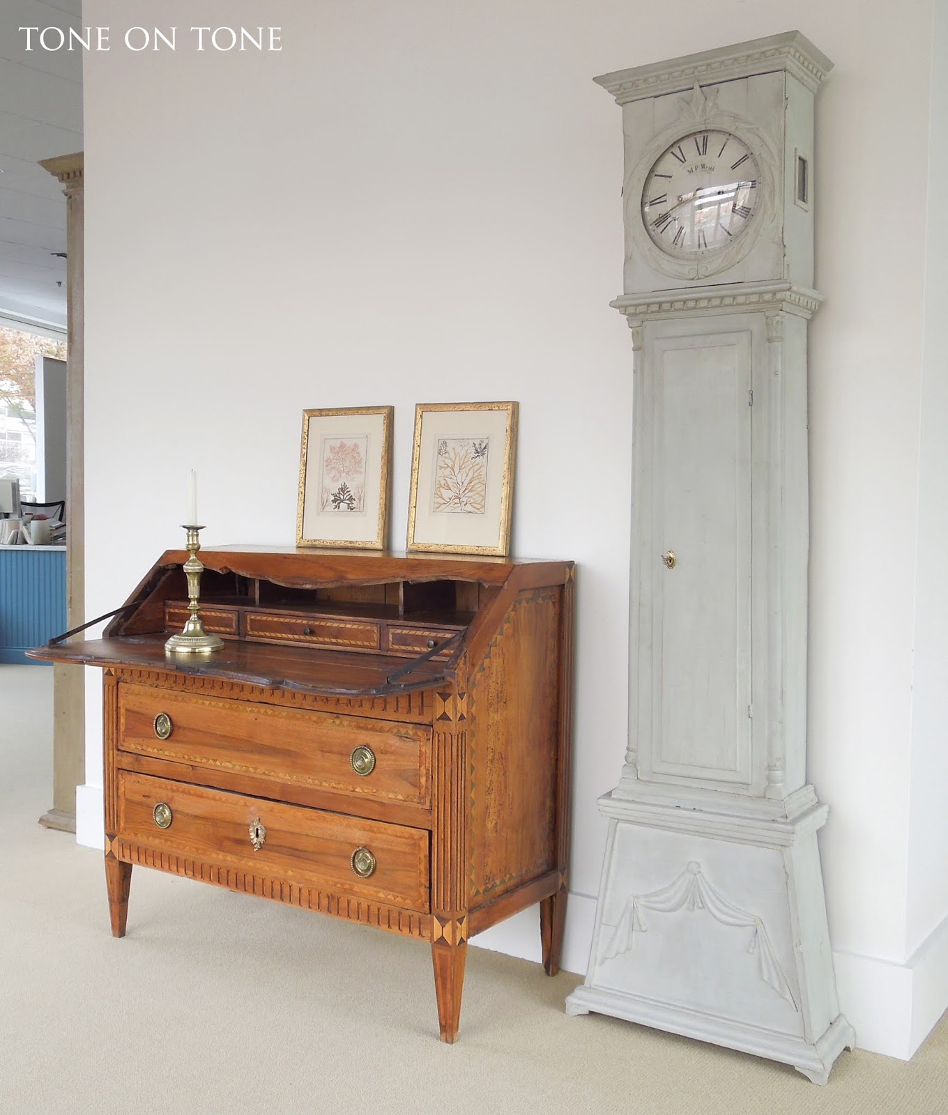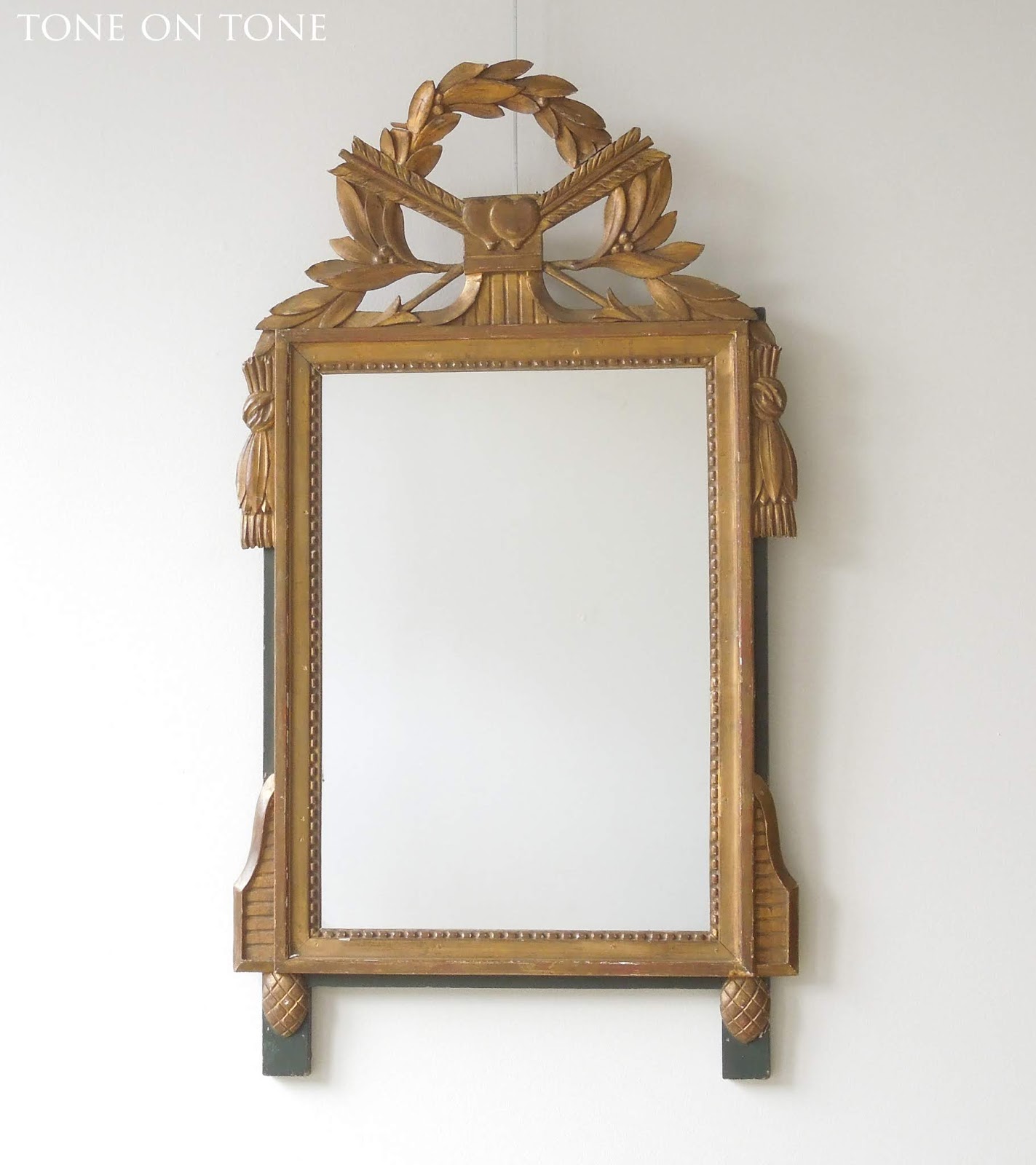 The small Swedish painted bench, French trumeau mirror, and Swedish cartel wall clock are all available. Please email info@tone-on-tone.com for more information.