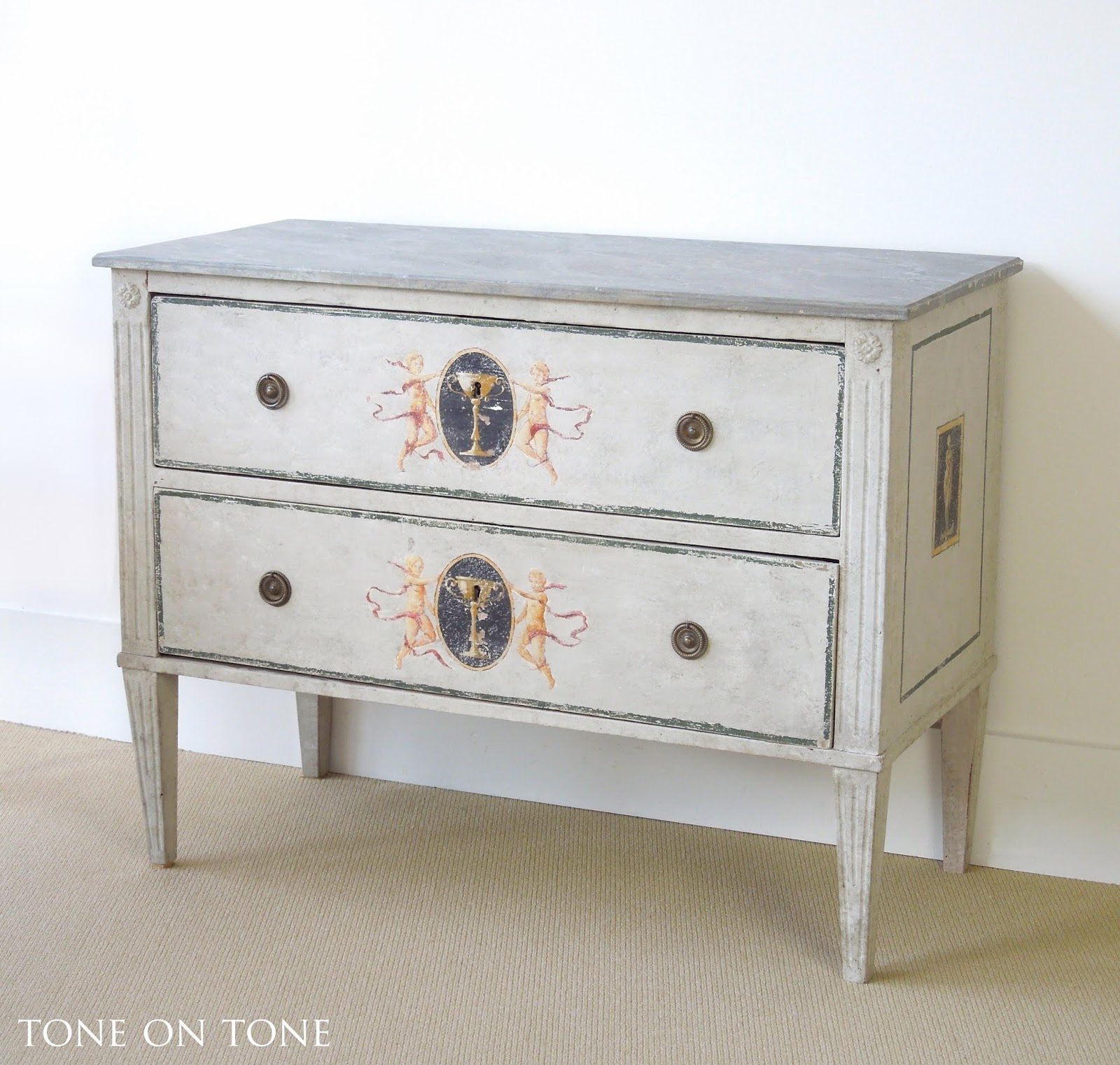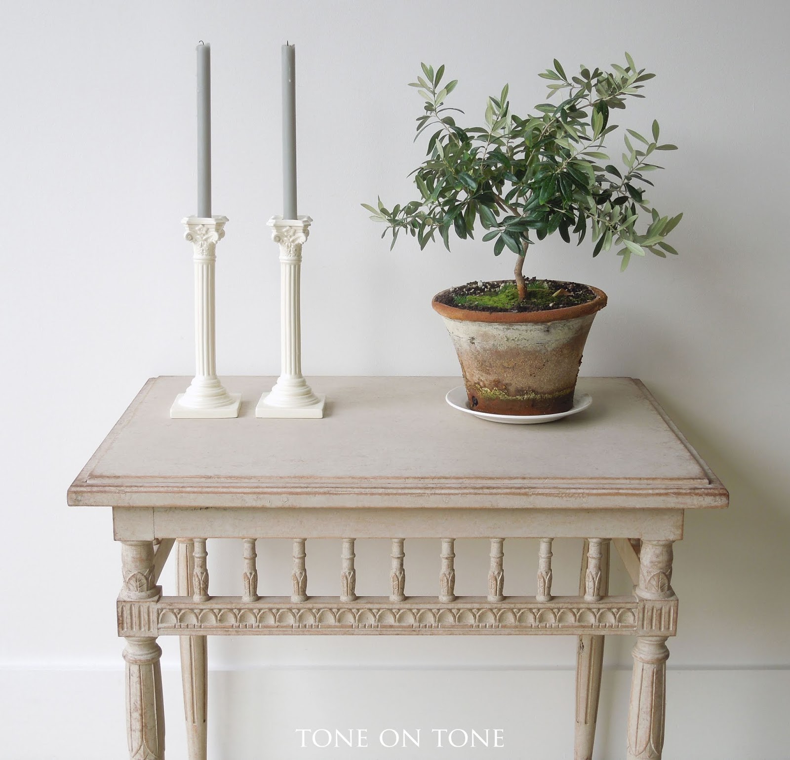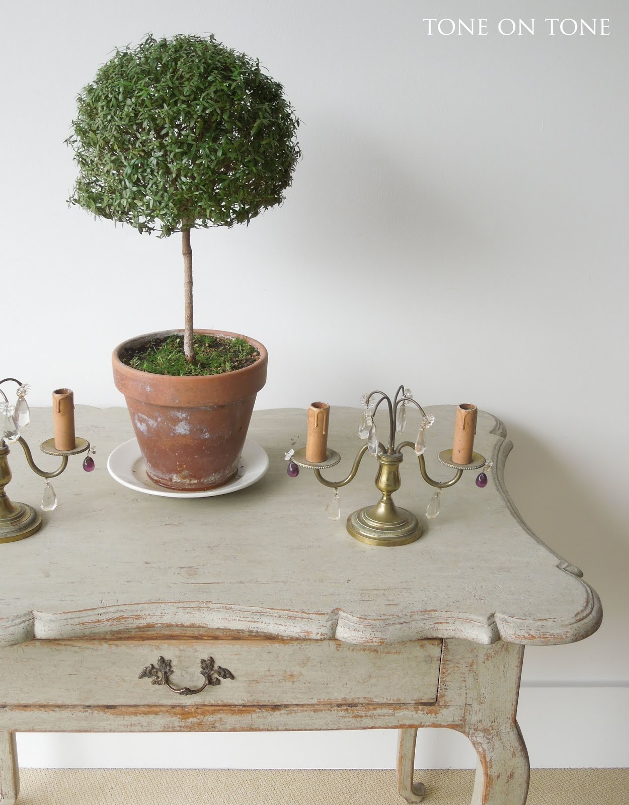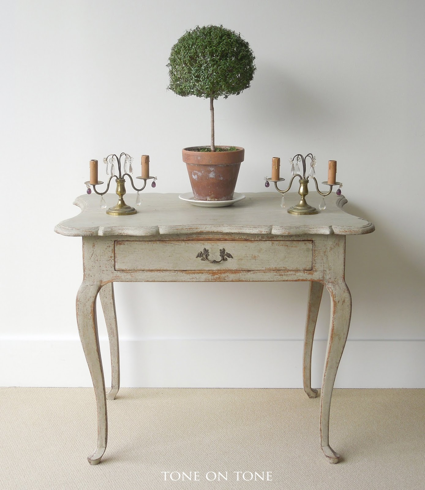 The small Swedish painted bench, French trumeau mirror, and Swedish cartel wall clock are all available. Please email info@tone-on-tone.com for more information.