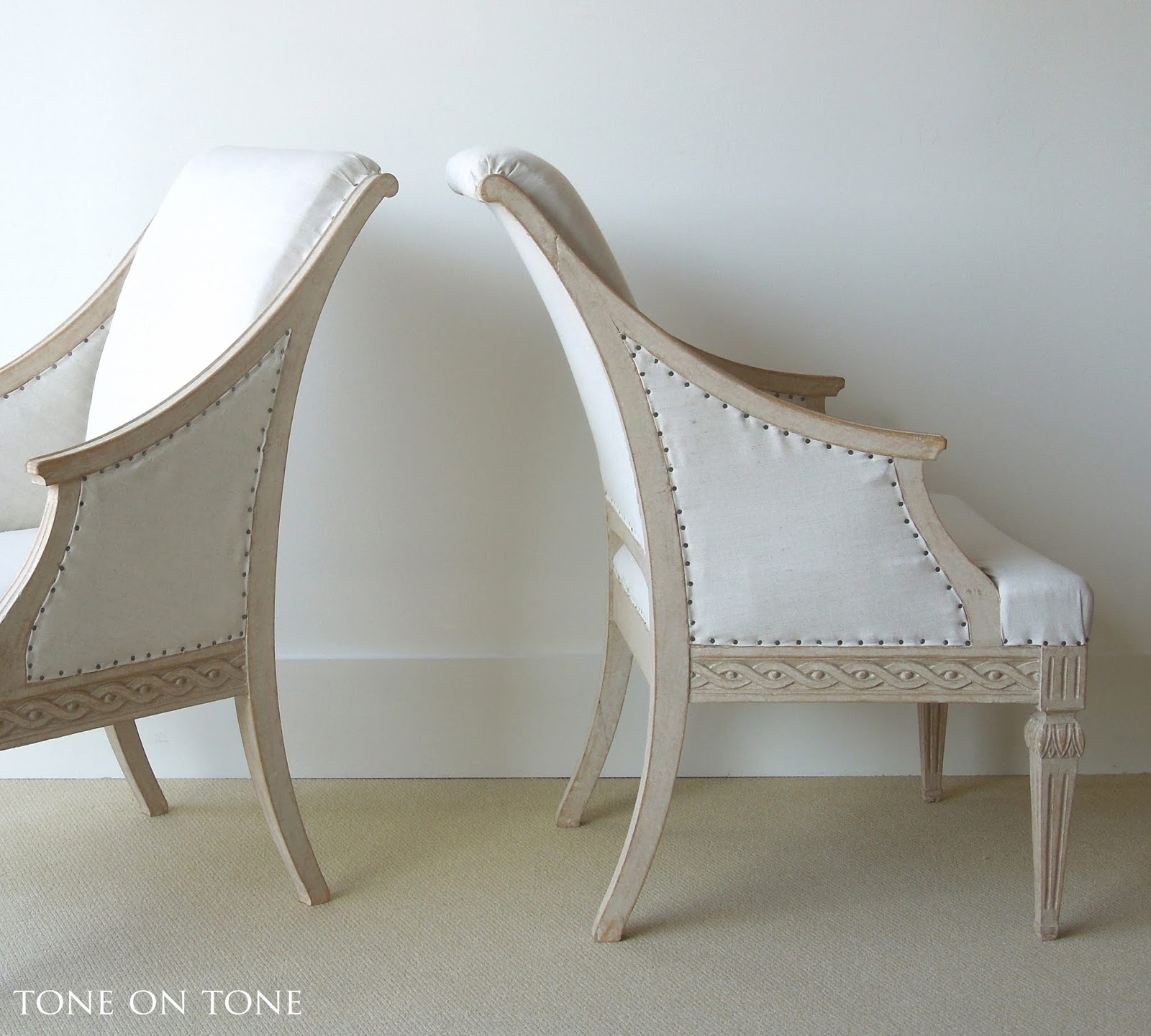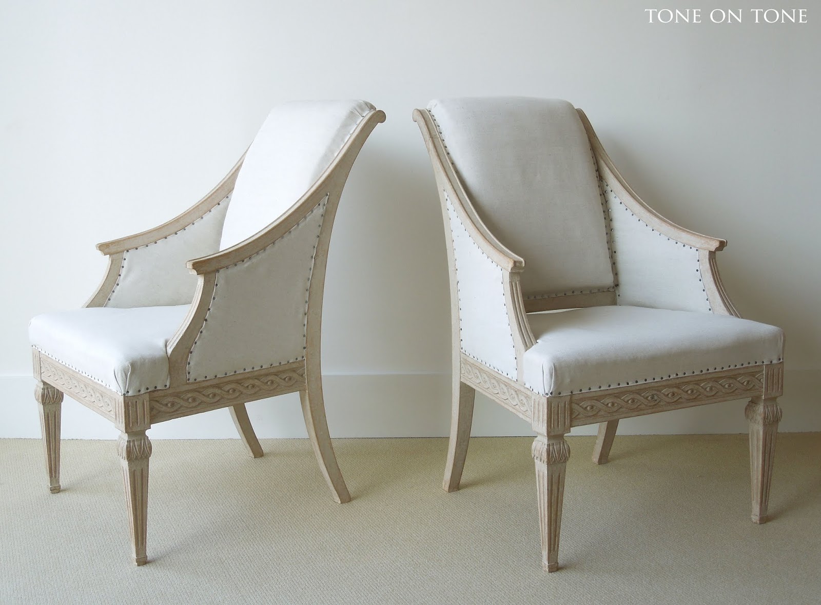 A pair of Swedish Gustavian armchairs that is good looking AND comfy! Plus, such sweeping lines and exquisite carvings. Instead of the ubiquitous nailhead trim, I opted for small iron tacks on the new linen upholstery. Each chair measures 24″ wide x 27.25″ deep x 37.5″ high.