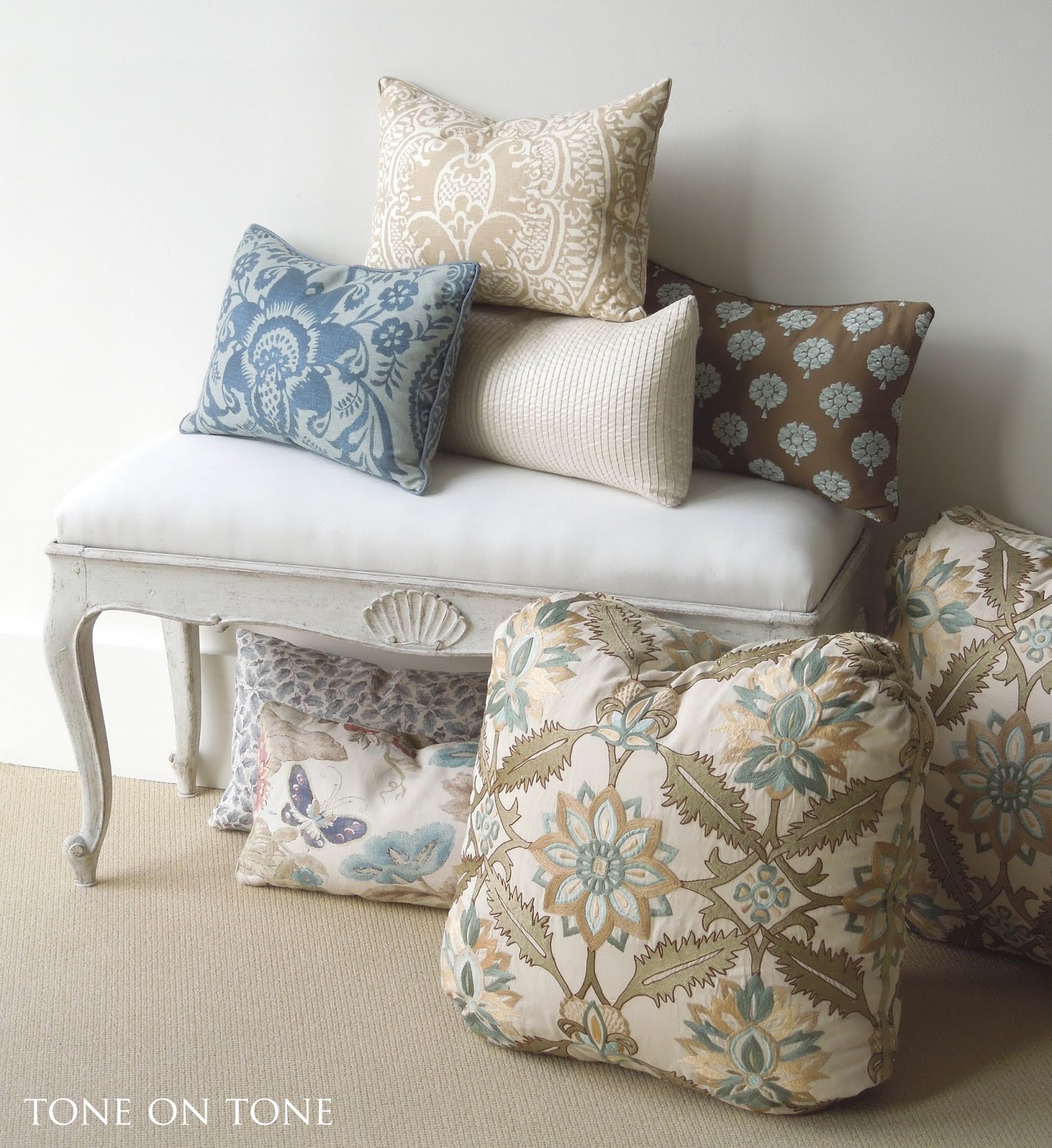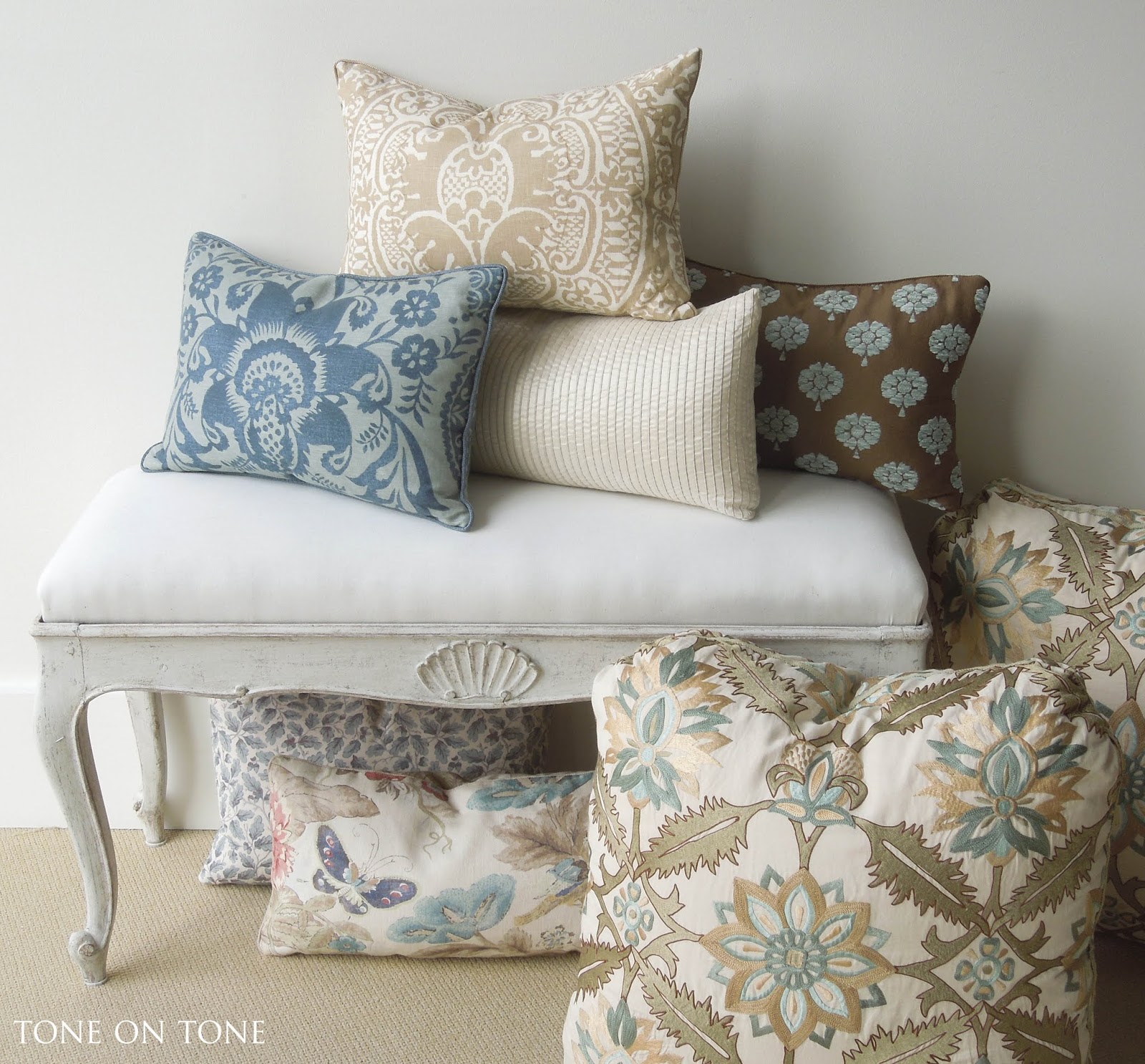 And loads of custom pillows in fabrics by Quadrille, Michael Smith, Lee Jofa, Peter Fasano, Cowtan & Tout, etc. Below is just a sampling.