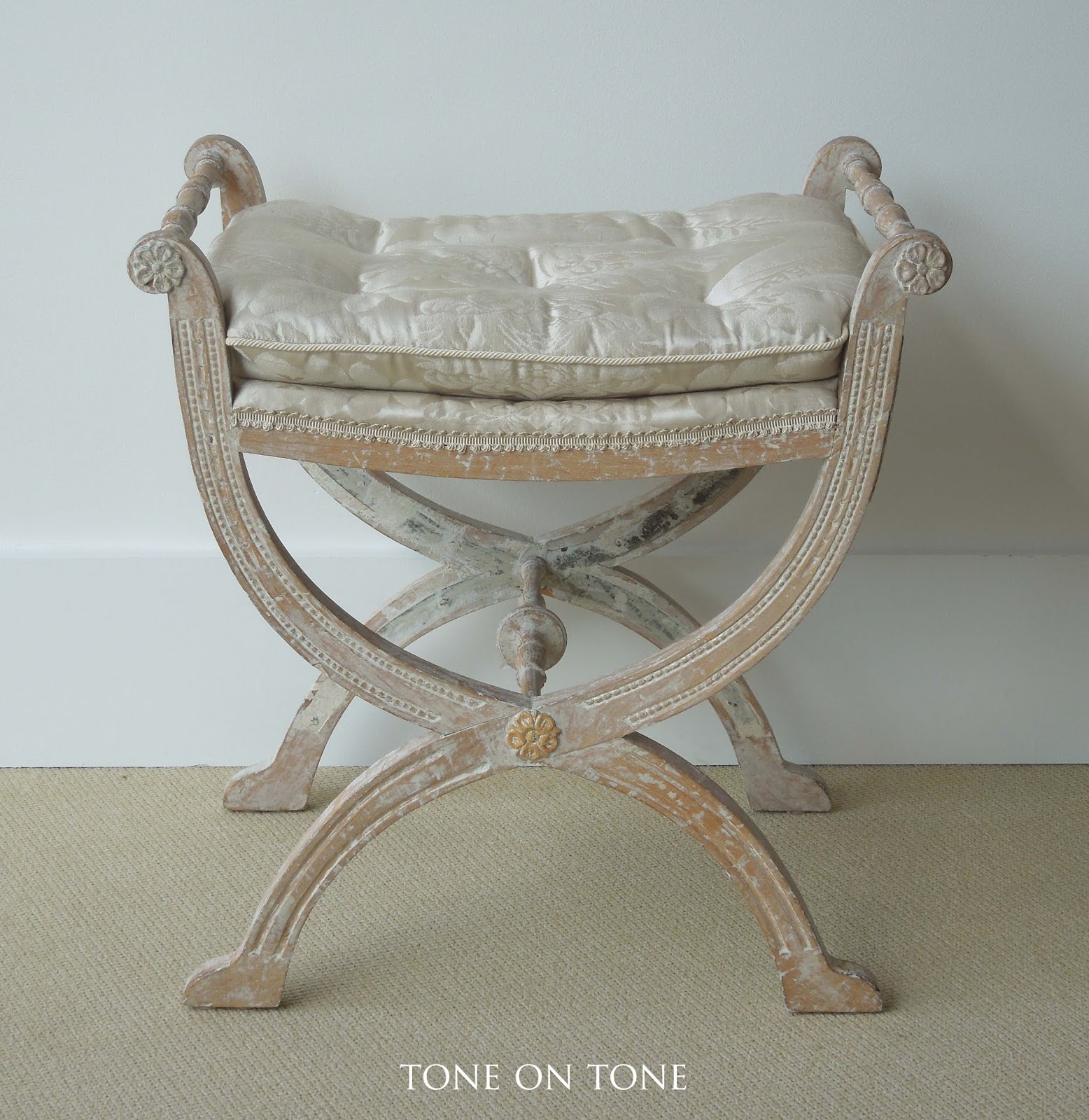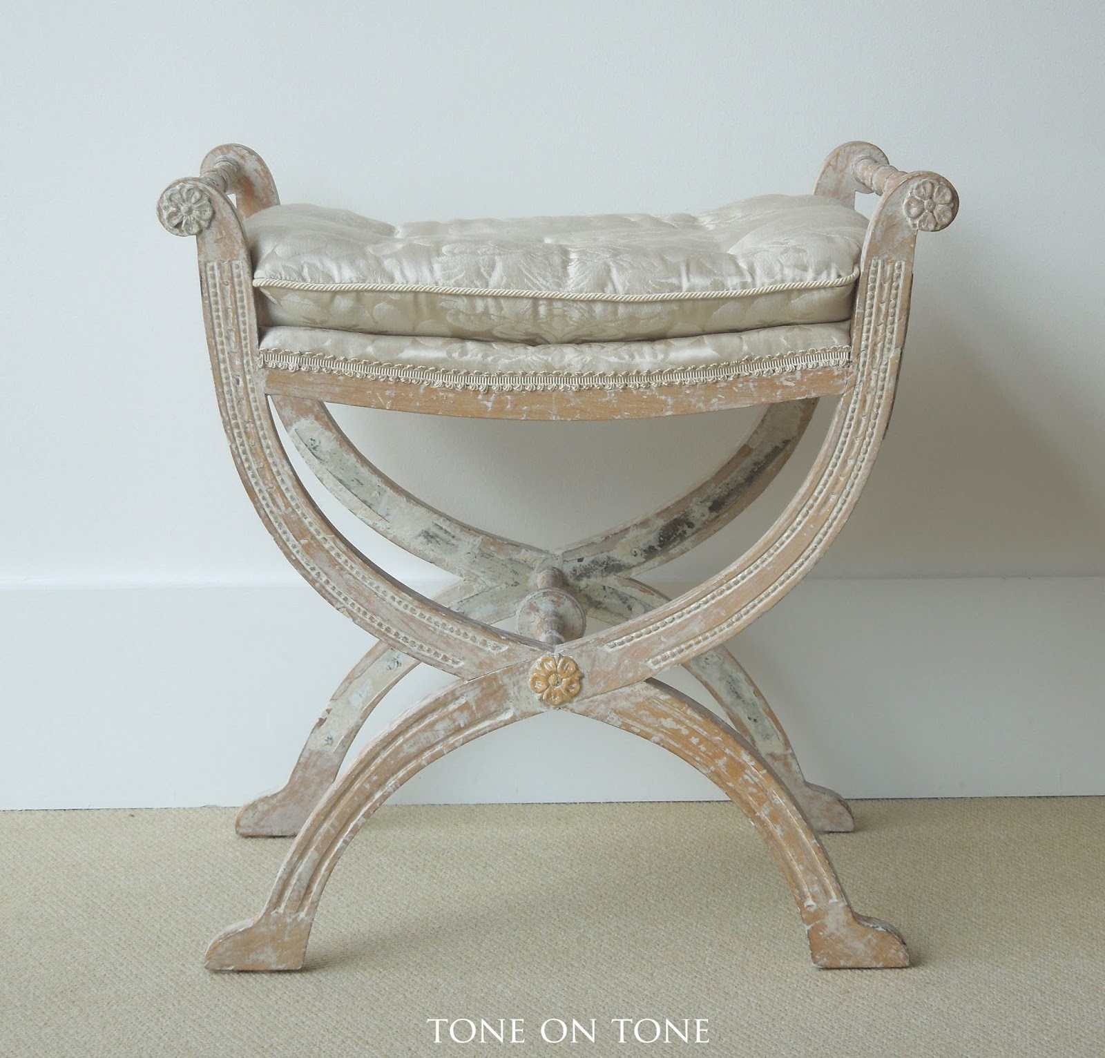 Gustavian grace – an early Swedish stool that’s been hand scraped to the original painted surface. Iron brackets were custom made to reinforce the curule legs during the 19th century. Upholstery is Claremont’s silk damask with trim by Samuel & Sons.