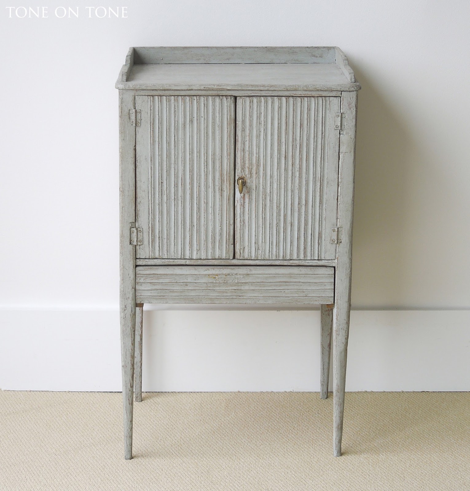 Here is an early 1800s Gustavian nighstand with signature reeding that is quintessentially Swedish! It has a raised gallery, pair of doors plus a blind drawer at the bottom. At 17.75″ wide x 13.25″ deep x 29.5″ high, it’s a smart choice for a small space in a bedroom, bath, master closet, etc.