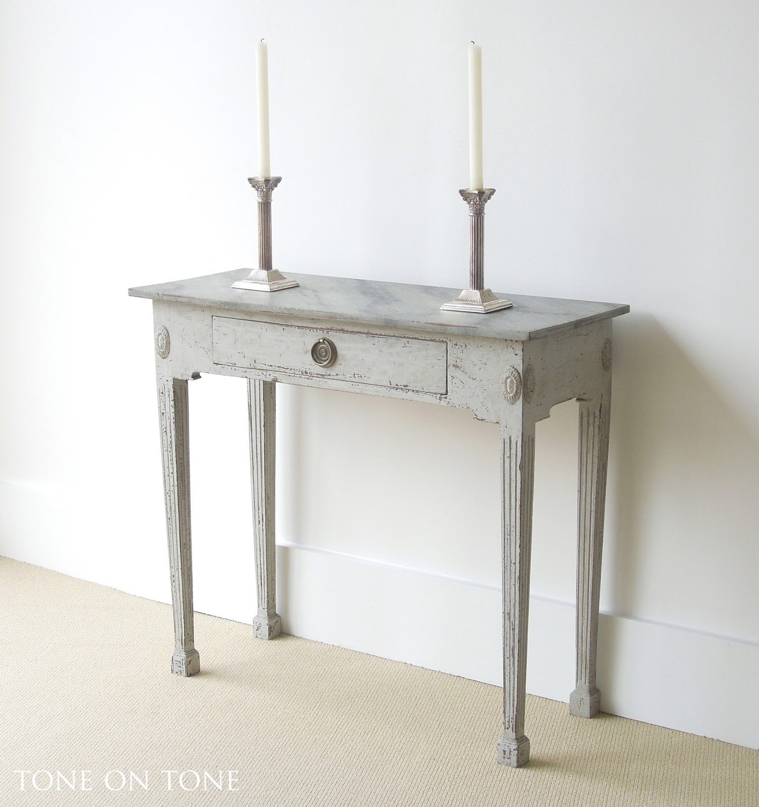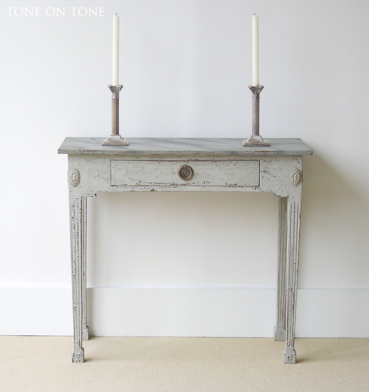 Are you looking for a small table that’s not deep? This 19th-century Gustavian console is only 33.5″ wide x 13.5″ deep x 30″ high. There is even a drawer for storage. Place a basket underneath for additional storage, and use it in a narrow entry, hall, etc. Note the shaped apron corners.