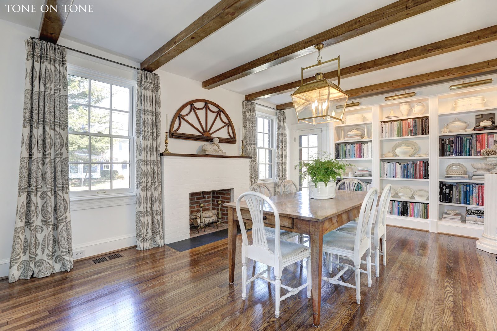 Freshen brown wood with simple upholstery, and pair it with painted furniture for an updated look. This very traditional ball-and-claw stool got a makeover with a casual but tailored slipcover in an organic cotton ticking of the palest tone-on-tone colorway. It’s tucked under a Swedish table (35.25″ x 18.75″ x 29.75″ high) that is understated yet elegant – note the beaded apron. The different styles allow each piece to stand out, rather than match each other.