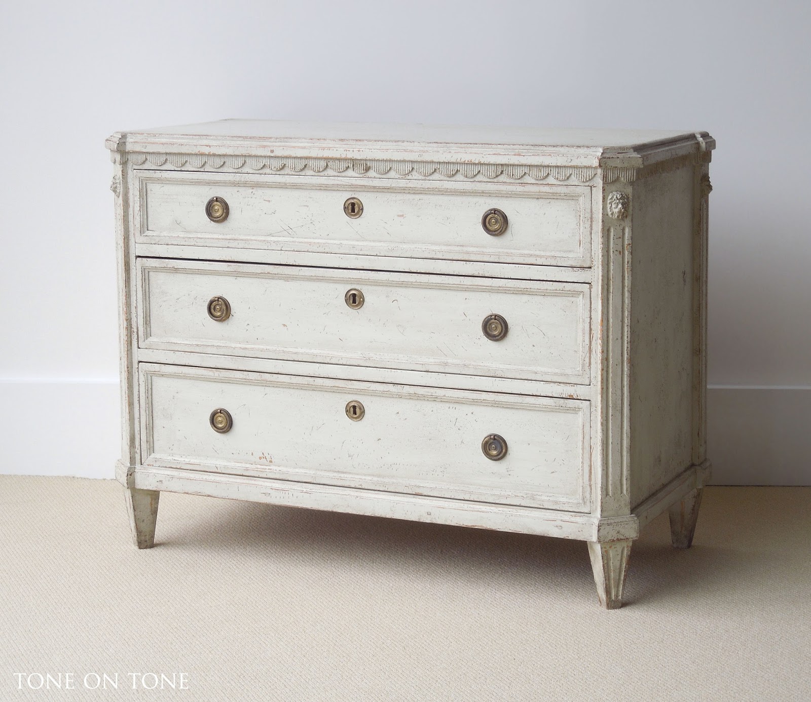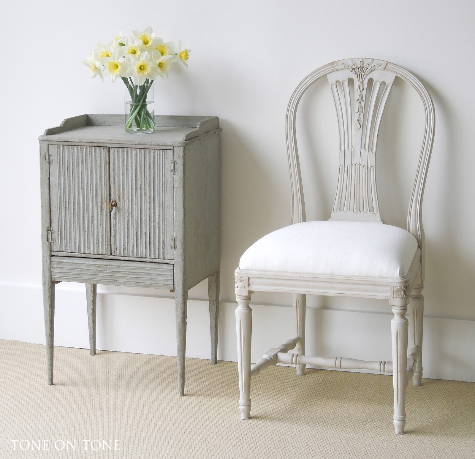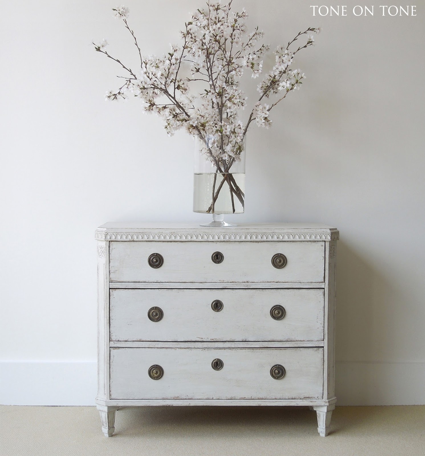 Time for cherry blossoms in DC! After a chilly delay, all the cherry trees are finally putting on their spring show. It’s a resplendent sea of pinks and whites!Shown here is a late 19th-century Swedish painted chest flanked by a pair of French limed chairs from the 1940s. The chairs, just upholstered in white linen, are from a set of four.