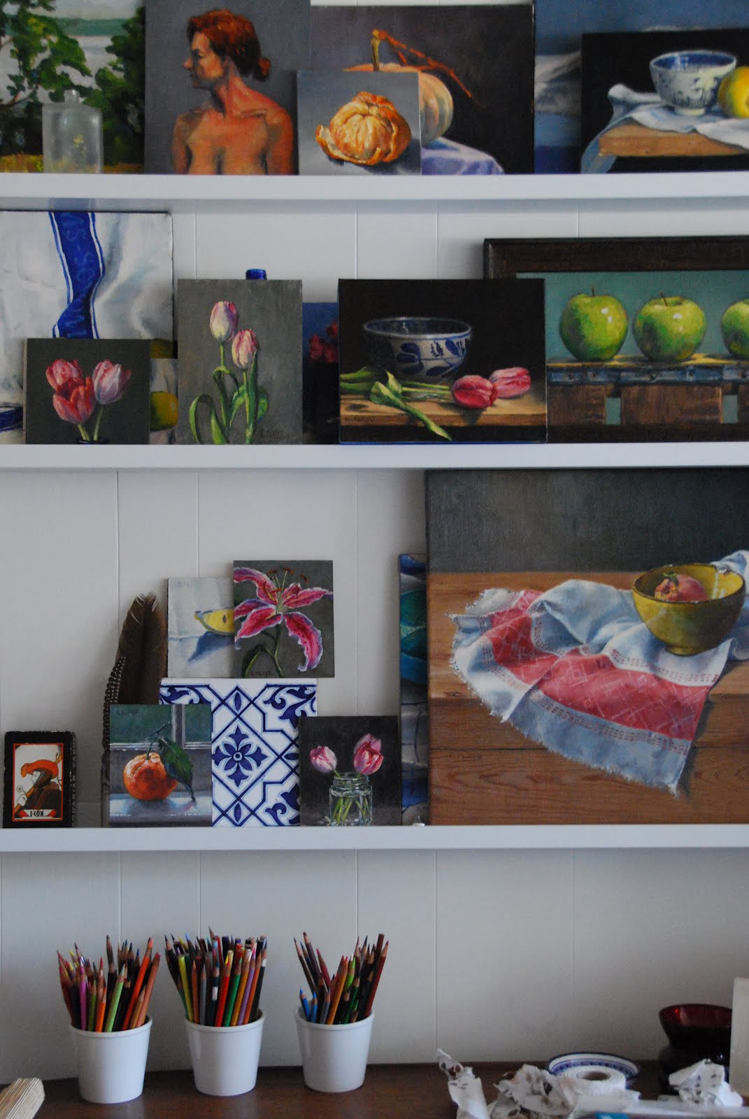 Liz paints only in natural light. Her collections of props, bottles, dishes, and natural curiosities are fascinating!
