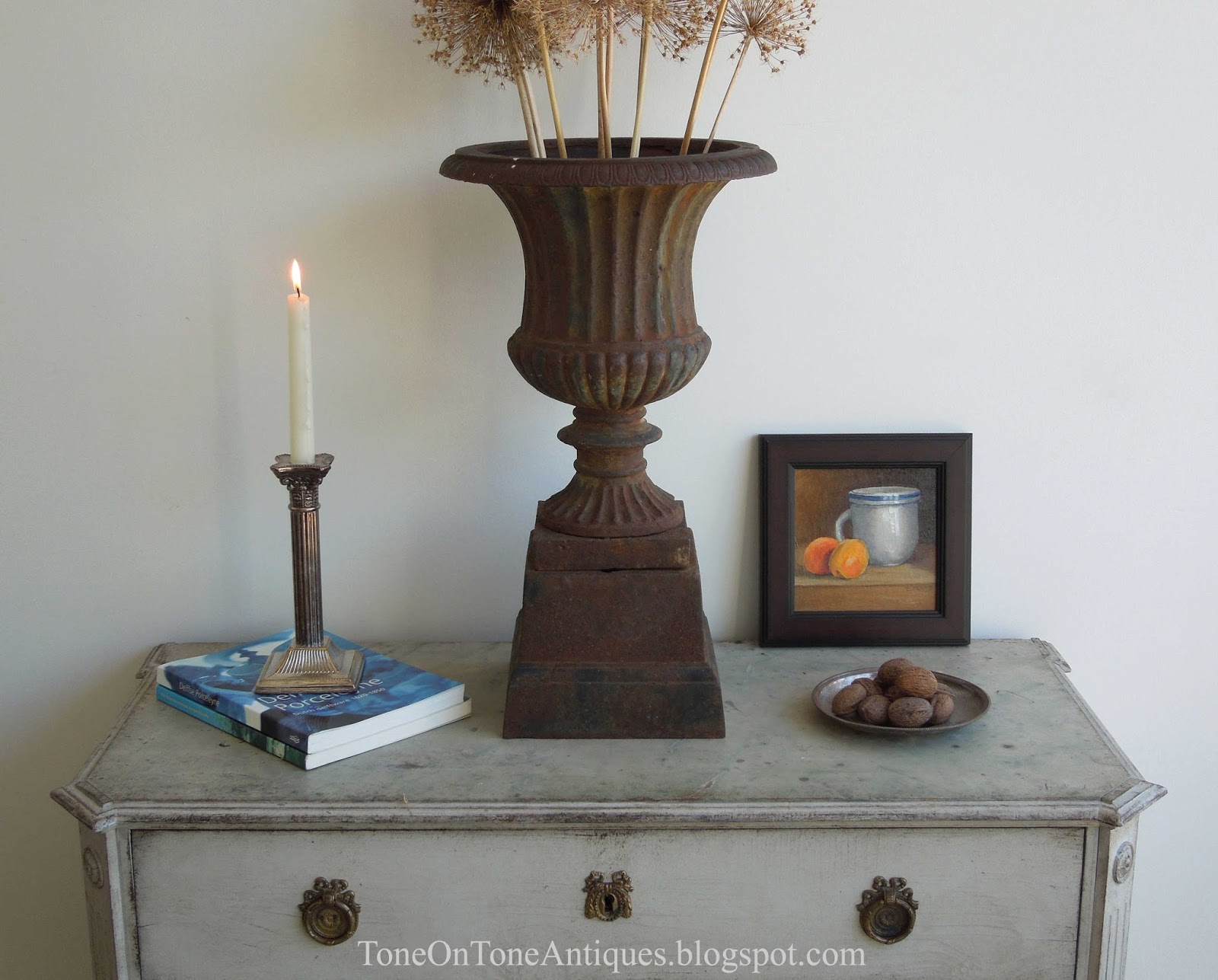 Option #2: Still Life with Fruit and Teacup. At 8 1/2″ x 8 1/2″ it is a perfect little square, and can be hung or propped. It was photographed in our shop on a Swedish Gustavian commode.