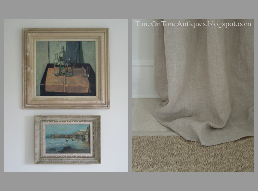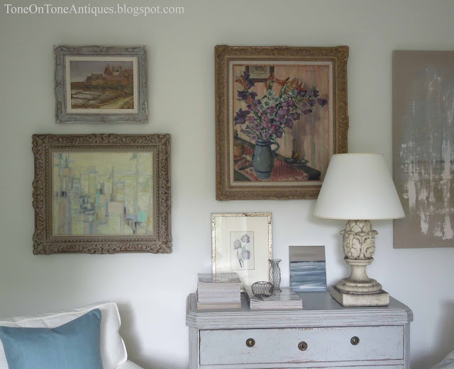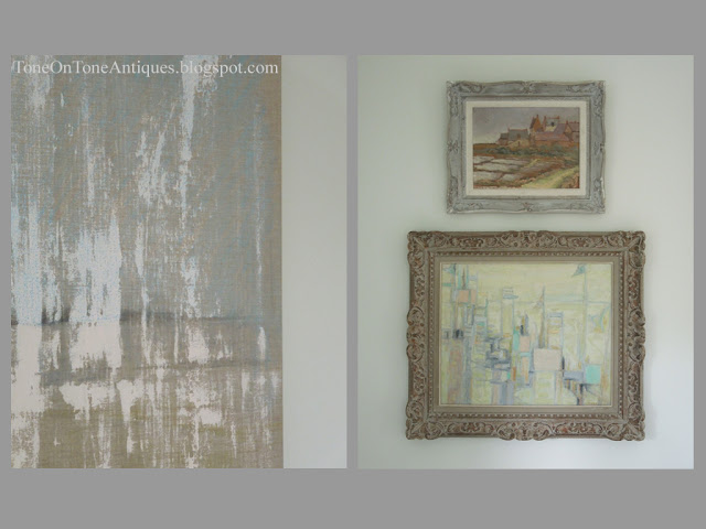 Perhaps the piece that doesn’t quite work 100% in the grouping is the abstract from Nantucket (above left). It is painted on a grayish natural linen which looks good with the curtains and linen liner of the floral still-life painting. So, for now, it is staying. On the top right are two mid 20th century French paintings: a Brittany landscape and rooftop scene of Paris. The rooftop painting is by Andre Lauran from the Ecole de Beaux Arts de Lyon.