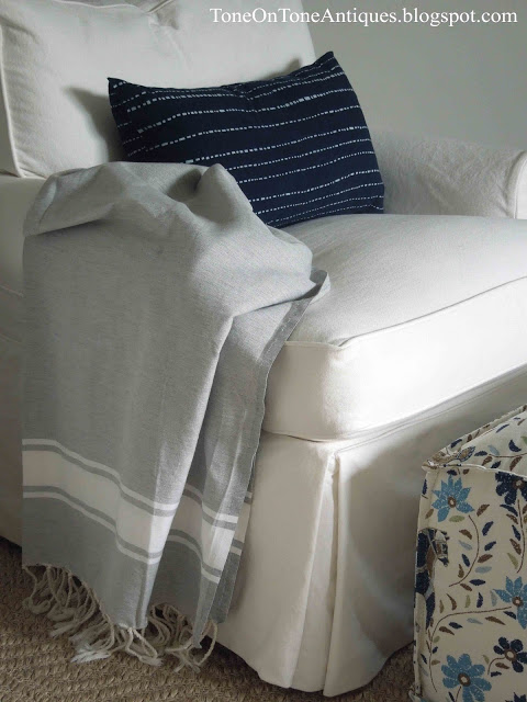 The newest addition is this blue-and-white pouf. I originally wanted a footed ottoman with a ticking fabric and dark legs, but didn’t have time to find one. Then, I happened upon this fun elephant pouf and thought: perfect! The size is just spot-on for the slipcovered chairs.