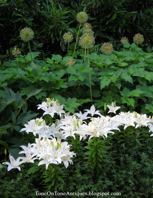 Above: Asiatic white lilies and Alliums poking through the foliage of Japanese Anemones. Below: